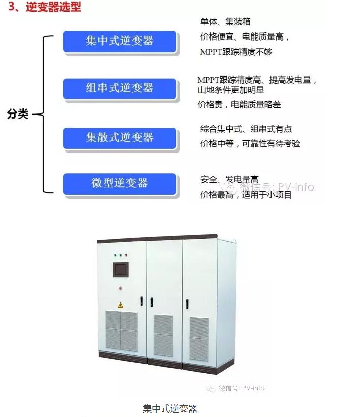 光伏逆變器主要分為:集中式逆變器、組串式逆變器、集散式逆變器、微型逆變器等。